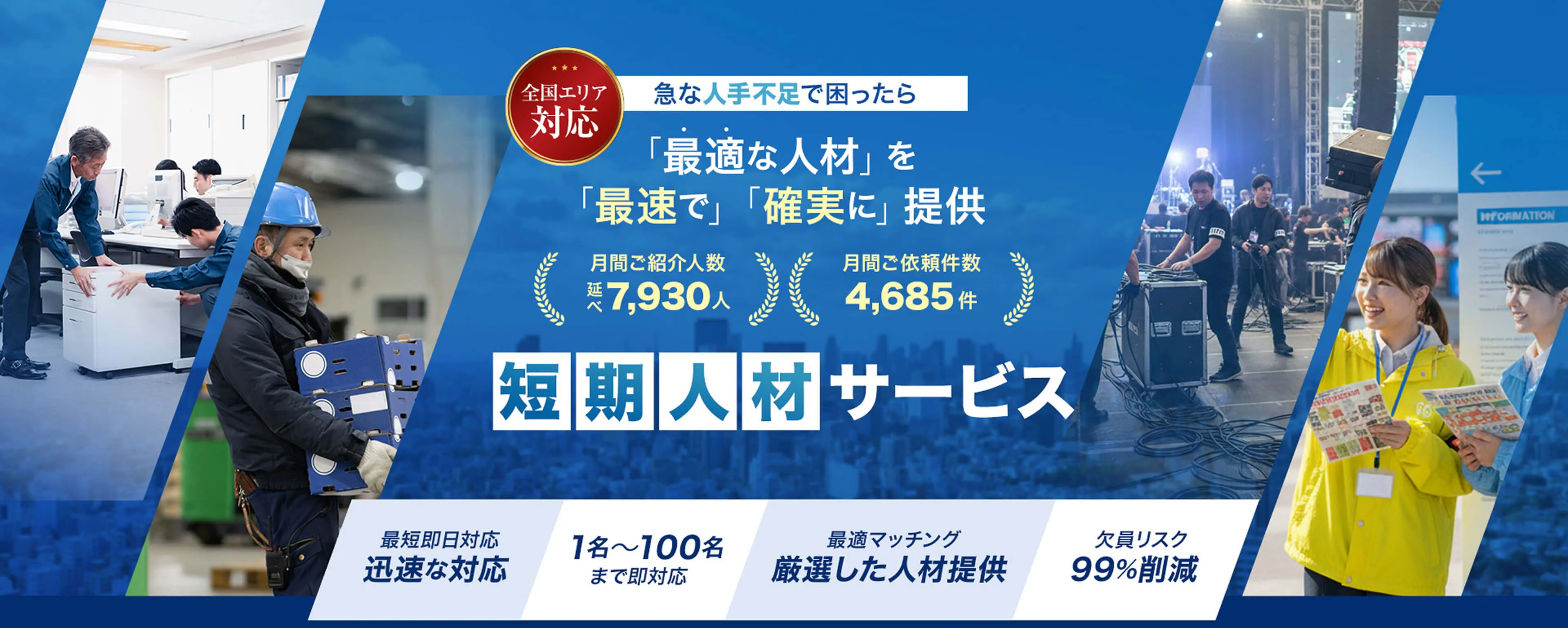 はい、1名〜100名まで即対応可能です。大型イベント、倉庫繁忙期など、規模を問わず柔軟に対応いたします。